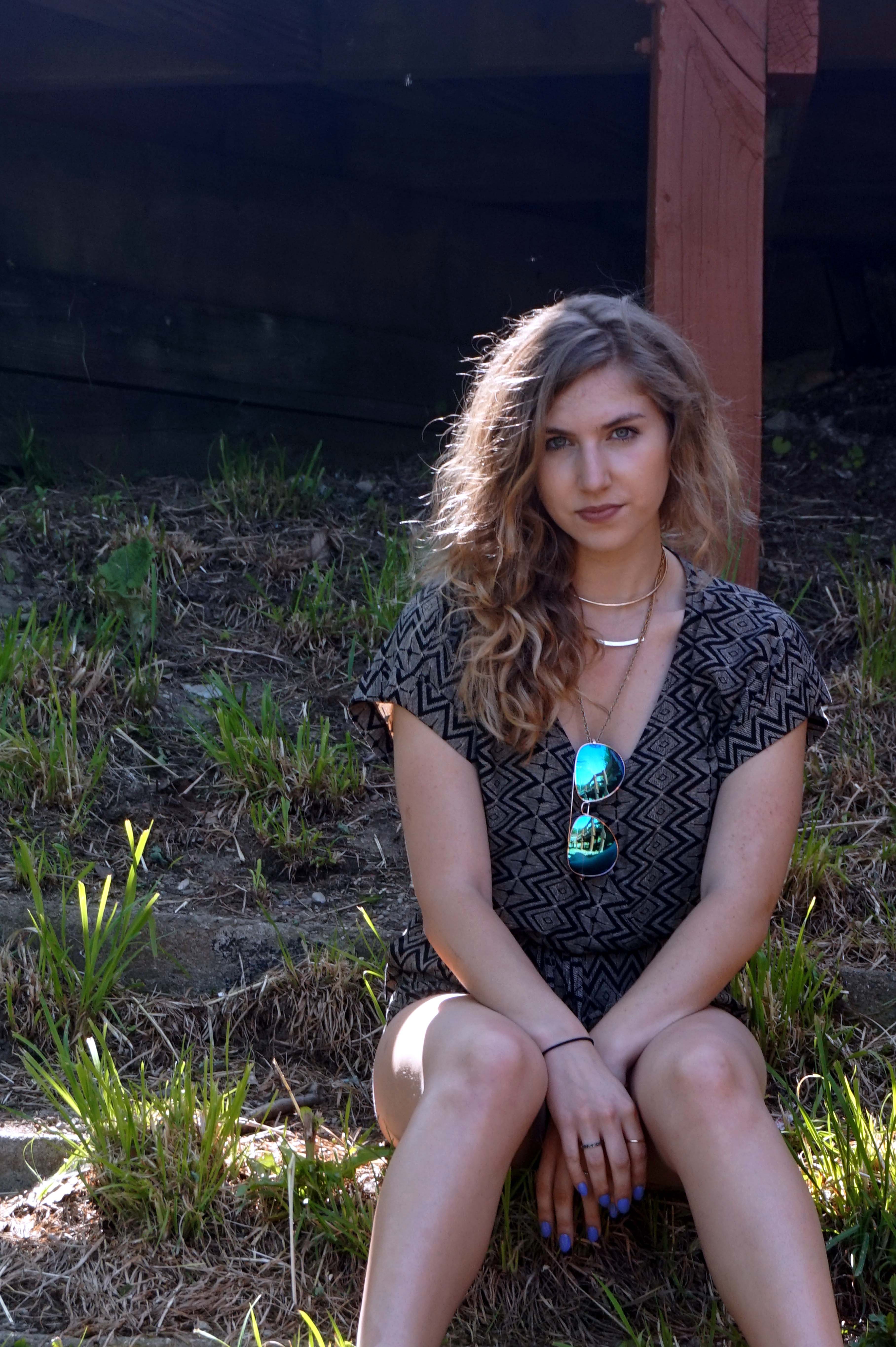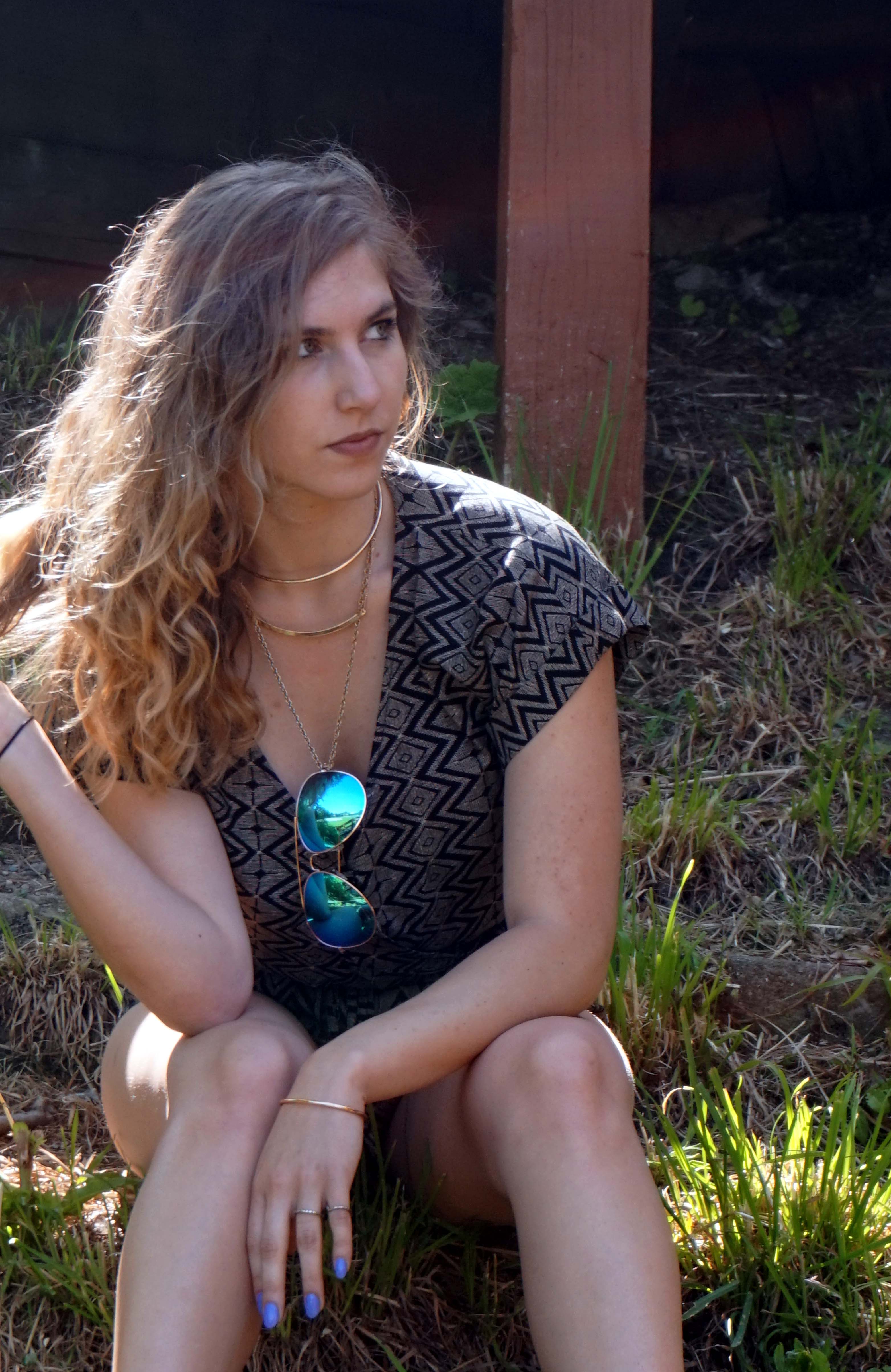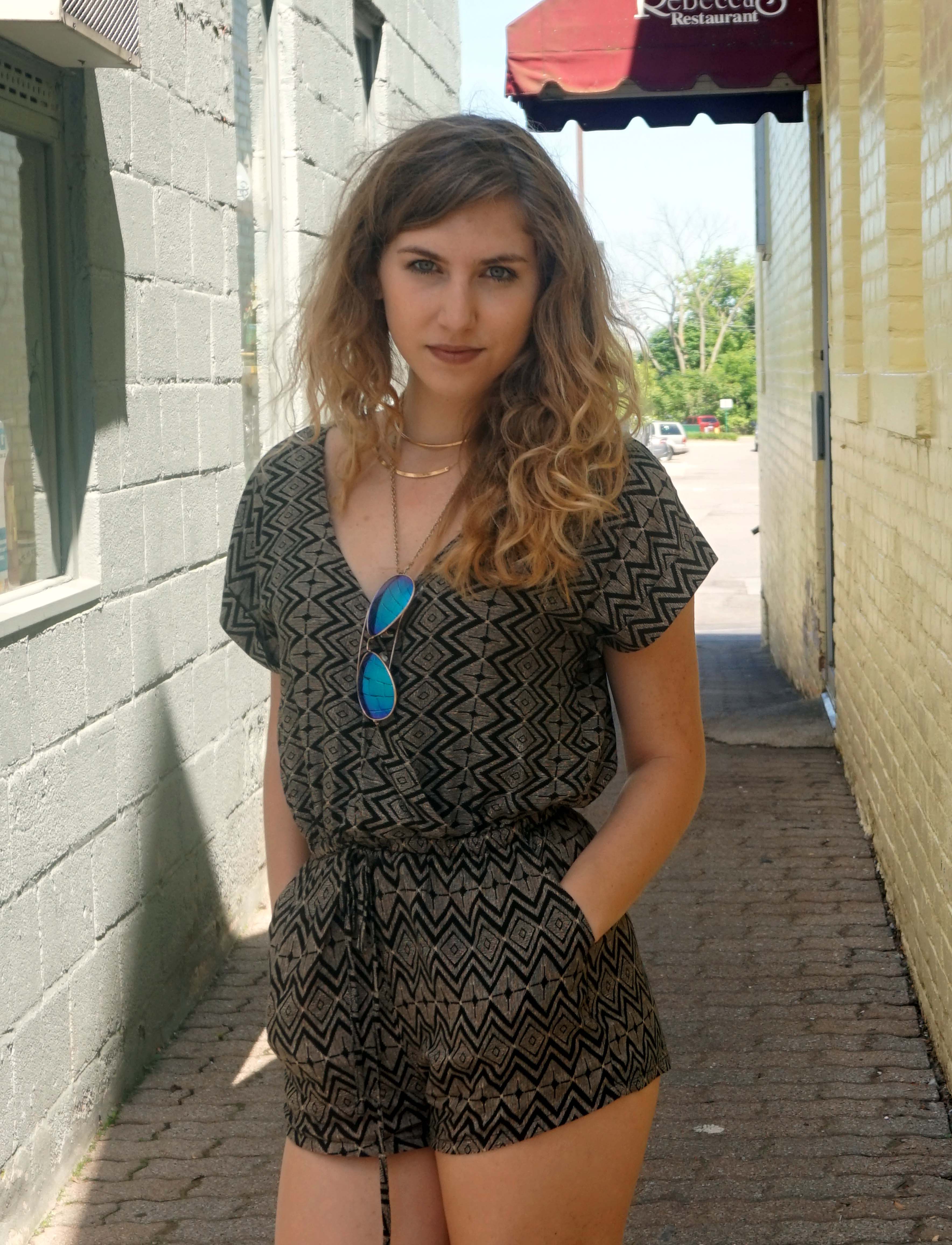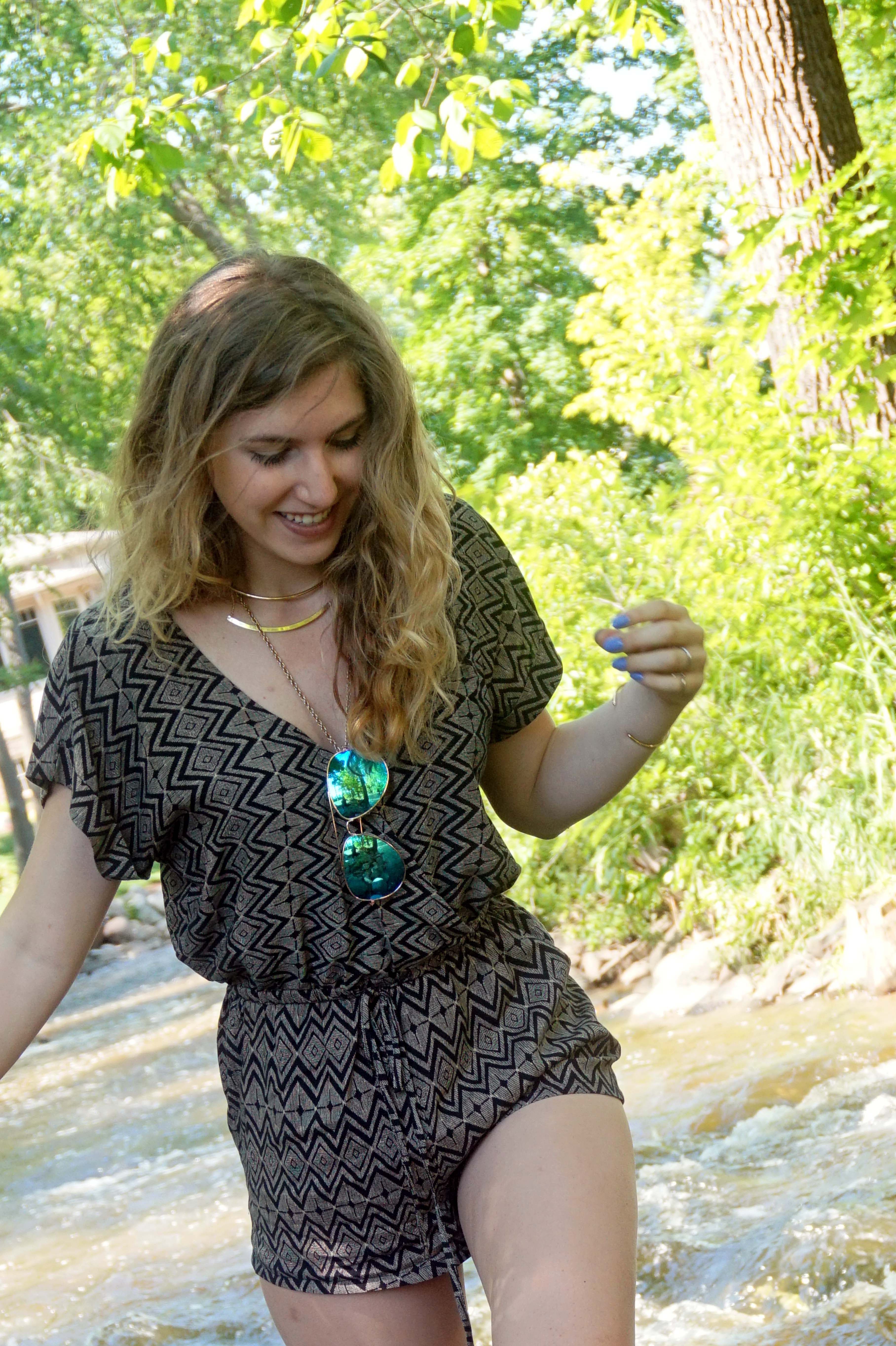 Specifically, this featured romper is one of my favorites. I love the earthy tones and geometric shapes. I love the waist cinching band in the middle for a girl with a small waist and wide hips like me as well. Just accessorize with some layered jewelry and gold accent sandals and Voila, a perfect outfit to romp around town in.