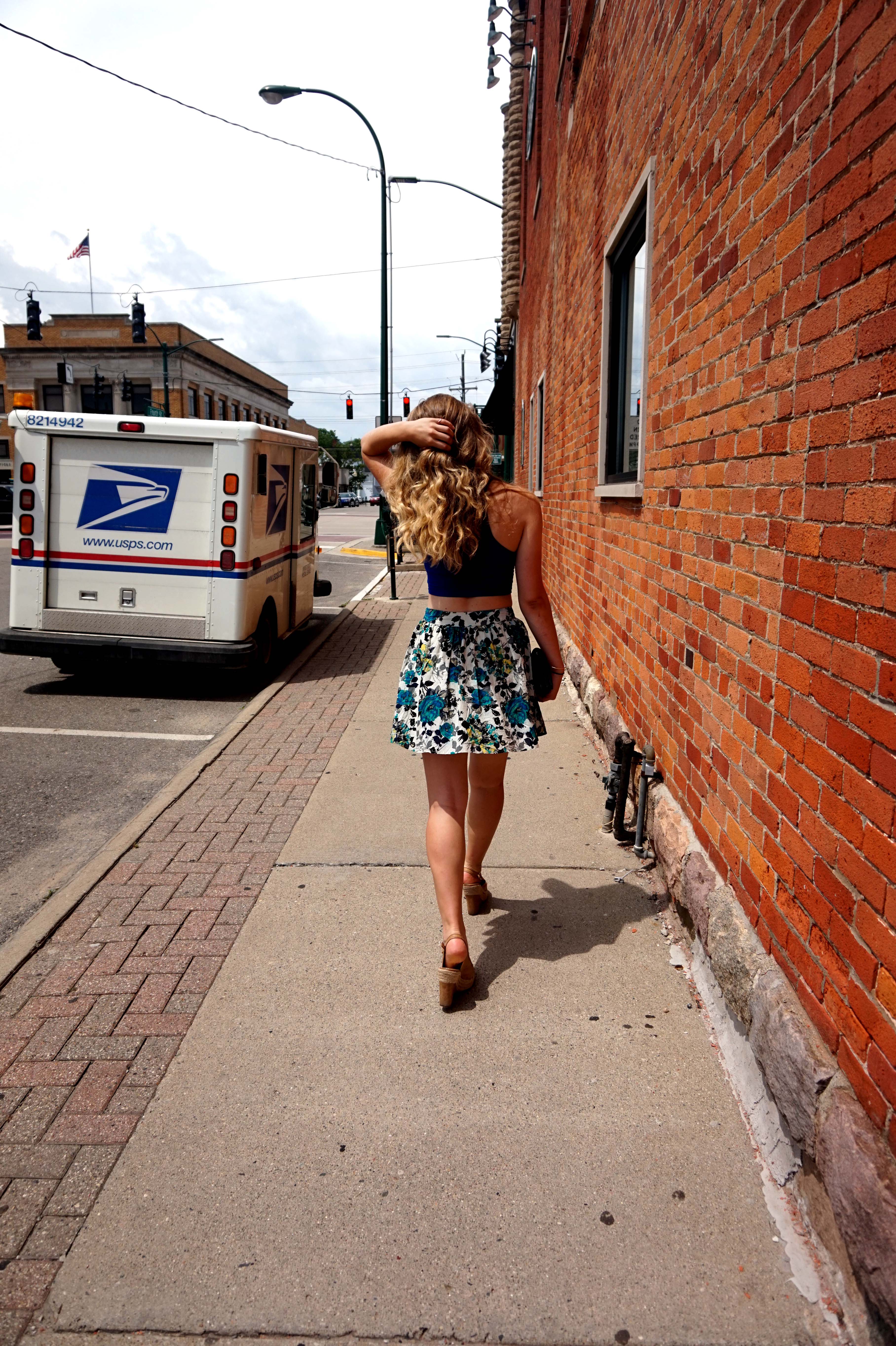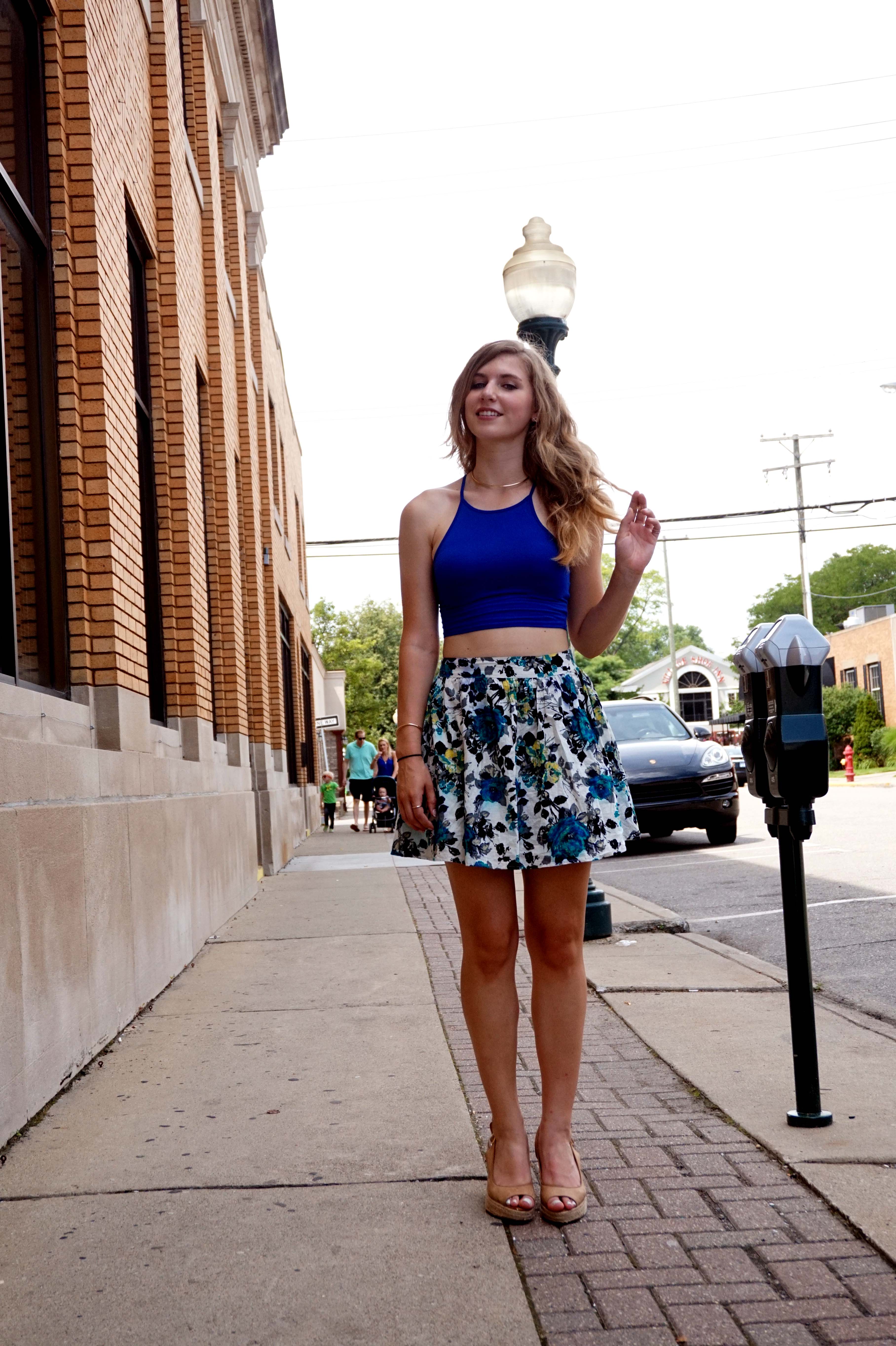 Summer has finally started for us Michiganders. The weather is getting hotter and our hair is getting bigger. And we still want to have brunch on patios. This look is a perfect fit for a hot day. This is not only because of the limited amount of shirt that I am wearing, but the material I am wearing. The outfit I chose is made from natural fibers. My circle skirt is made of 100% cotton and my shirt is 95% cotton with 5% spandex. These natural fibers will allow your skin to breathe, while something made of 100% polyester will suck the heat and contain it on your skin.