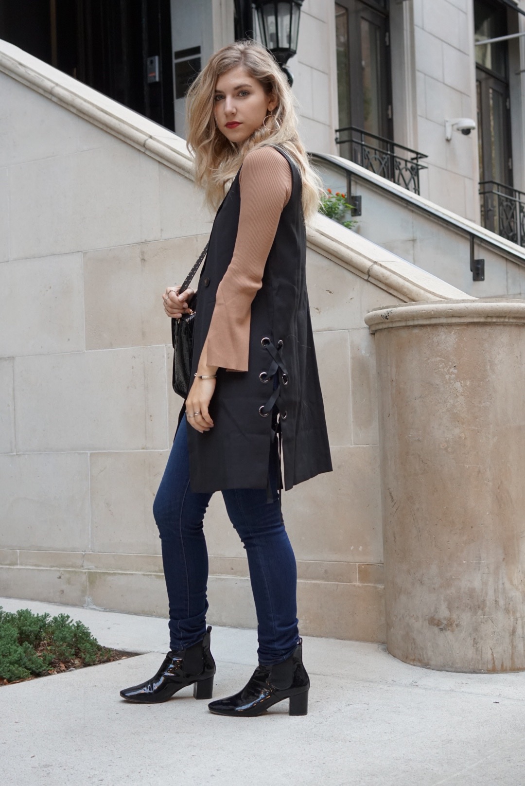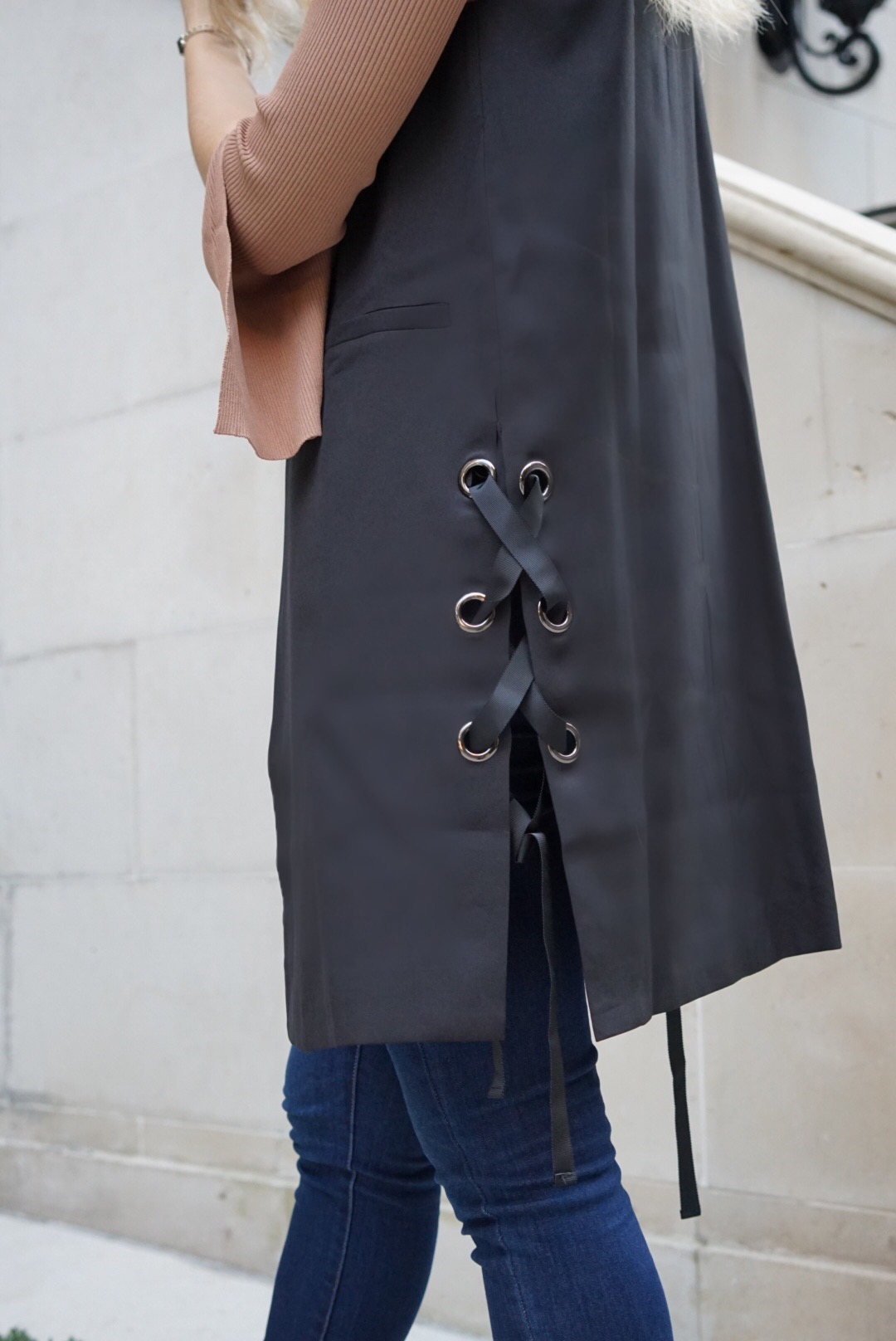 This long-line vest is so cool. It is very structured, but unique because of it’s lace up sides. This piece can take any rather ordinary look and make it fabulous. I layered this boat-neck sweater with an exaggerated sleeve underneath and I got perfection.