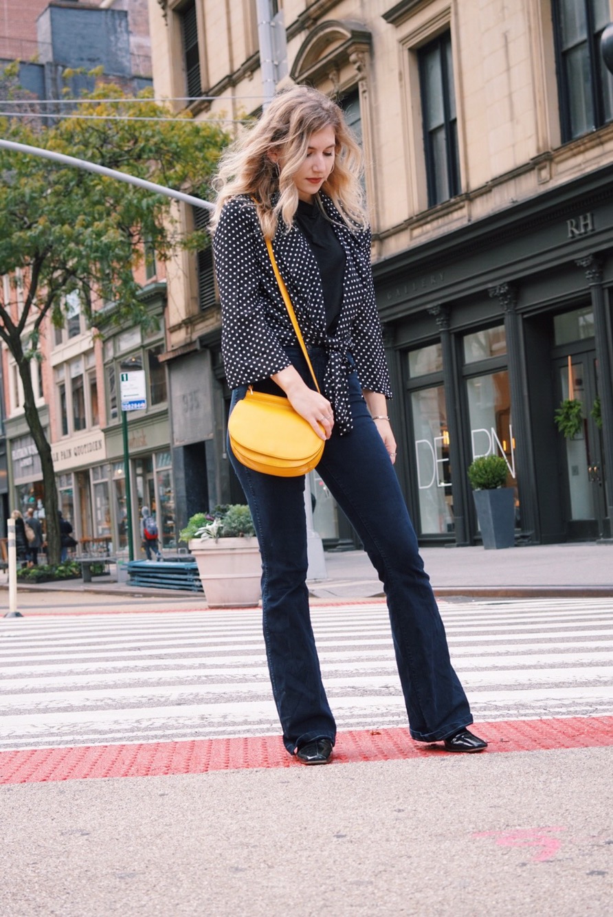 Hey guys! A short and sweet post for you this week. I put a little twist on my regular look. I went with a printed tie jacket to spice up my favorite high neck top. I then added a bit of contrast with this perfect yellow bag. I love this yellow tone with its 70’s look and the polka dots with the retro vibes. I definitely think the two pieces are complimenting each other well. Shop the pieces below!