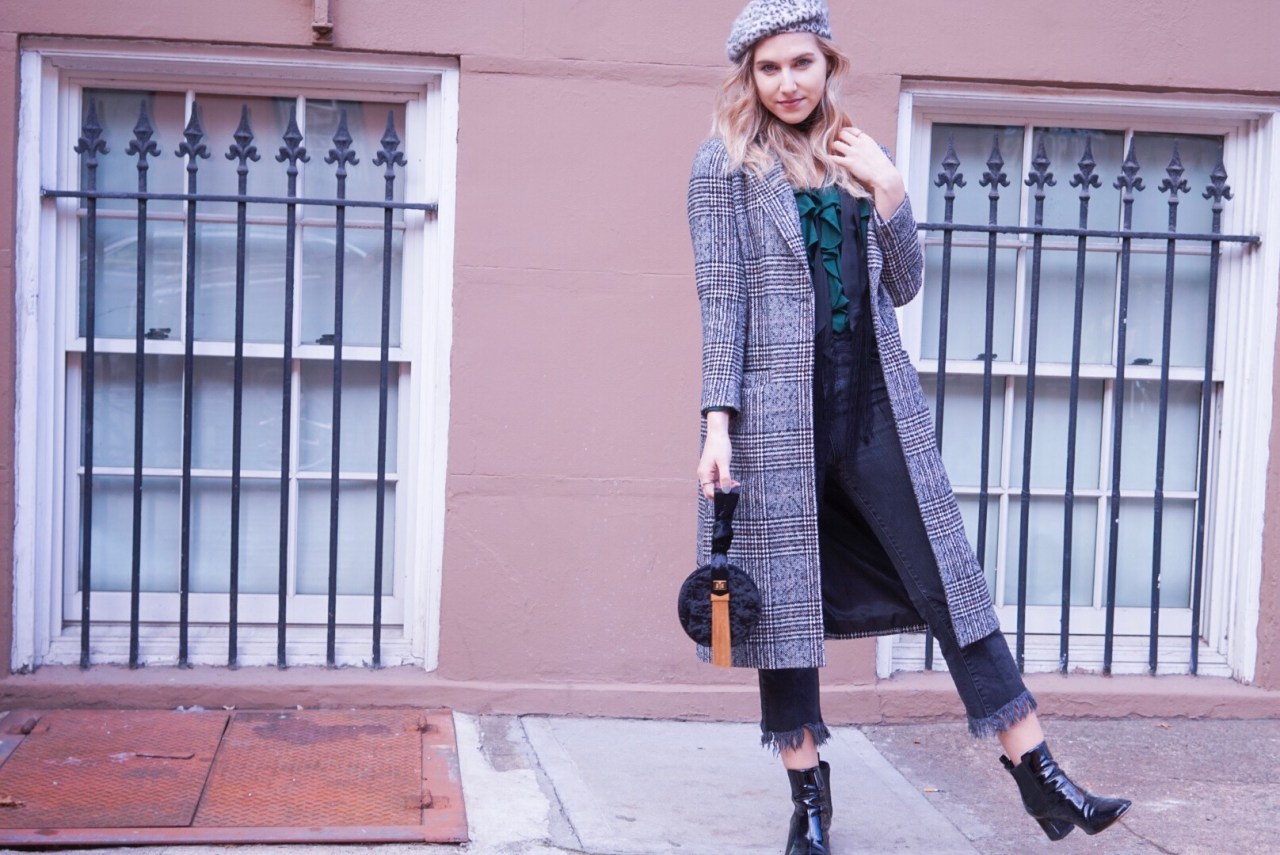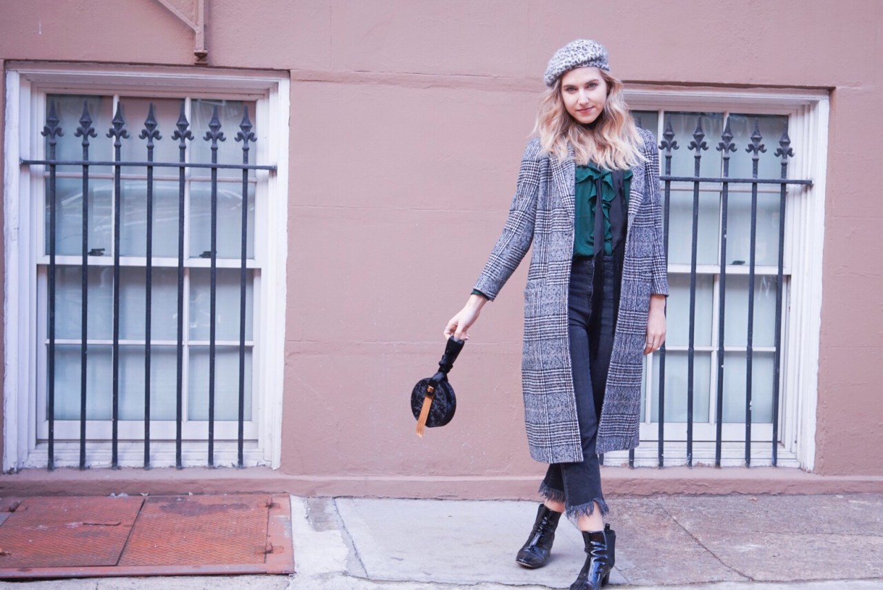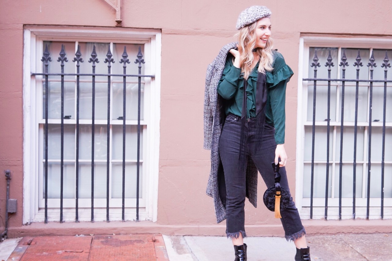 I absolutely love this look. My favorite light winter coat with my favorite (only) beret and my new little “it” bag. I started this look with this gorgeous dark green ruffle blouse, I then added my frayed high waisted jeans and topped it off with my classic skinny scarf.