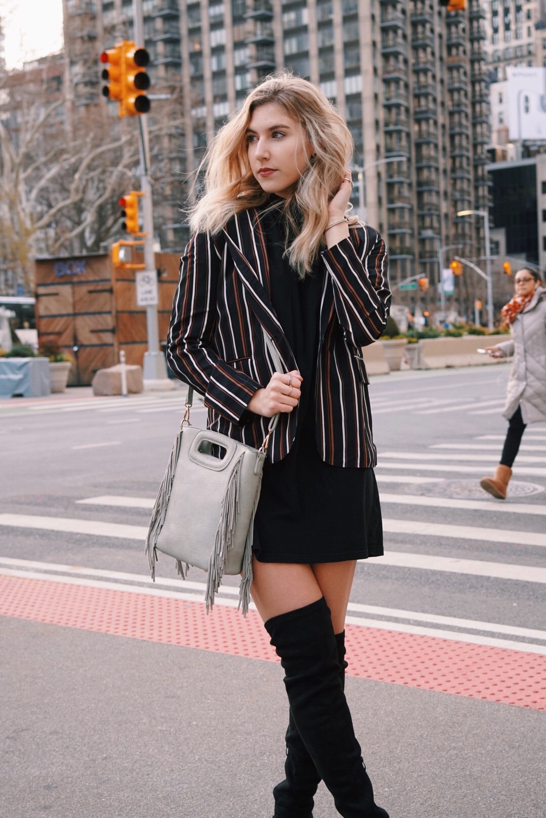 Asos Dress / Striped Blazer Similar / Black Over The Knee Boots / Pink Haley Fringe Bag